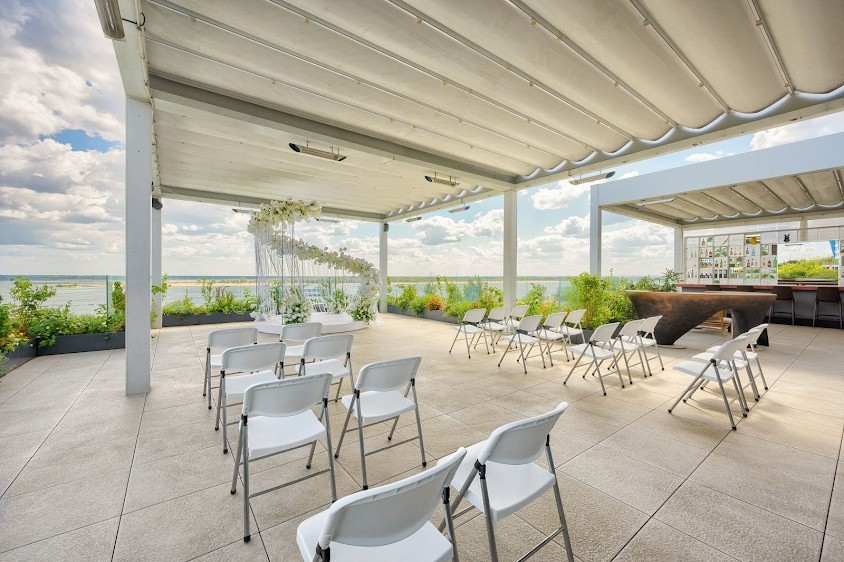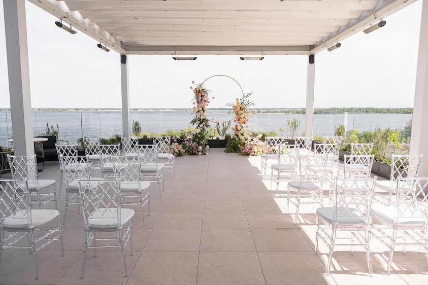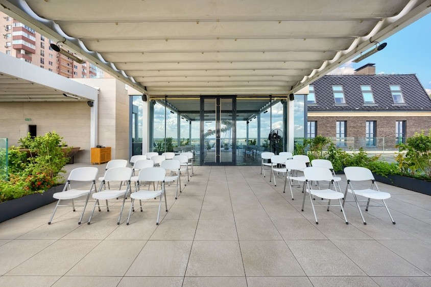 - Из зала есть выход на террасу, где можно организовать выездную регистрацию и фуршет.